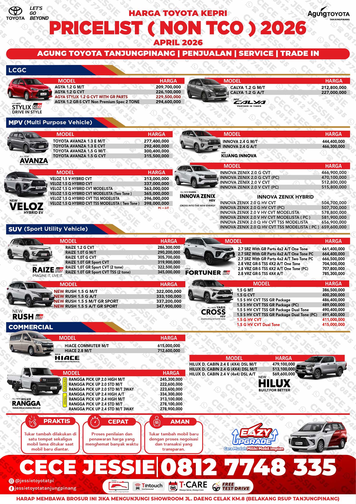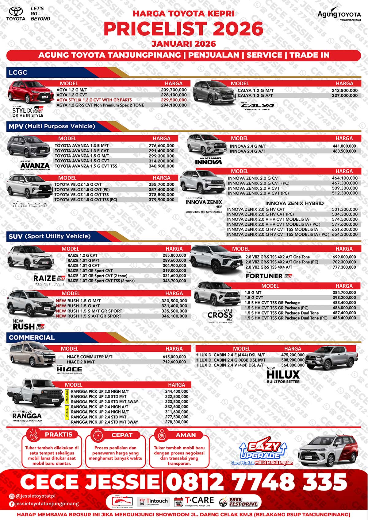 Toyota Tanjung Pinang – Hubungi Sales Marketing Mobil Dealer Toyota Tanjung Pinang Untuk Info Harga Terbaru Di Tanjung Pinang Meliputi Harga Mobil Toyota Calya, Avanza, Veloz, Sienta, Kijang Innova Zenix, Voxy, Vellfire, Alphard, Agya, Yaris, Raize, Rush, Fortuner, CHR, Corolla Cross, Land Cruiser, Vios, Corolla Altis, Camry, Hiace, Hilux, Dyna, Toyota 86, Supra, BZ4X. Dan Juga Promo, Paket Kredit, Diskon, Cashback, Simulasi Kredit Dan Test Drive Mobil Toyota. Tersedia Promo DP Kredit Murah dan Cicilan Ringan, Proses Cepat Atau Paket Kredit Bisa Disesuaikan Dengan Kemampuan Anda. Hubungi Sales Marketing Kami Segera Untuk Mendapatkan Pelayanan Terbaik dan Kunjungi Alamat Showroom (Dealer) Resmi Kami Atau Jika Anda Sibuk Kami Bersedia Berkunjung Ke / Di Tempat Anda. Menerima Tukar Tambah Mobil Seken / Bekas Atau Jual Beli Mobil Second, Mobil Bekas Anda Juga Bisa Dijadiin DP / Uang Muka Mobil Baru (New) Toyota. Jika Mobil Anda Mengalami Kerusakan Atau Ingin Di Servis Segera Bawa Ke Bengkel Resmi Kami. Dapatkan Info Promo Update Terbaru Toyota Tanjung Pinang Setiap Bulan Januari Febuari Maret April Mei Juni Juli Agustus September Oktober November Desember Setiap Tahun 2025 2026 2027.